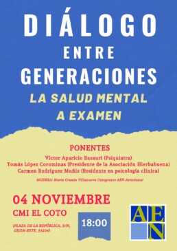 Desde la AEN-Asturiana queremos informaros de la actividad que hemos organizado para el próximo lunes 4 de noviembre a las 18:00 h en el CMI El Coto (Gijón): “Diálogo entre generaciones: la salud mental a examen”.